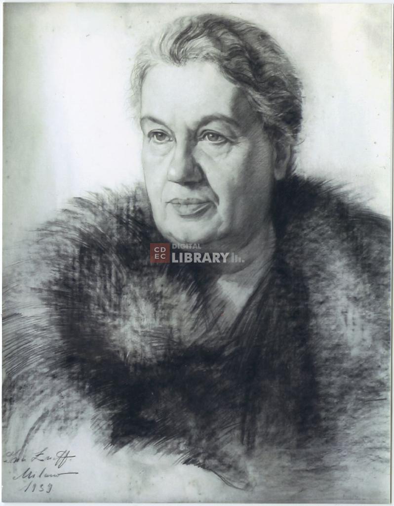 notizie storico-critiche | La fotografia riproduce il ritratto della scrittrice per l'infanzia Lina Schwarz, eseguito a carboncino da Camillo Zuffi a Milano nel 1939. Il ritratto venne raccolto in occasione dell'esposizione "Donne ebree in Italia. Immagini di vita tra Ottocento e Novecento" ma non fu presentato in mostra. |