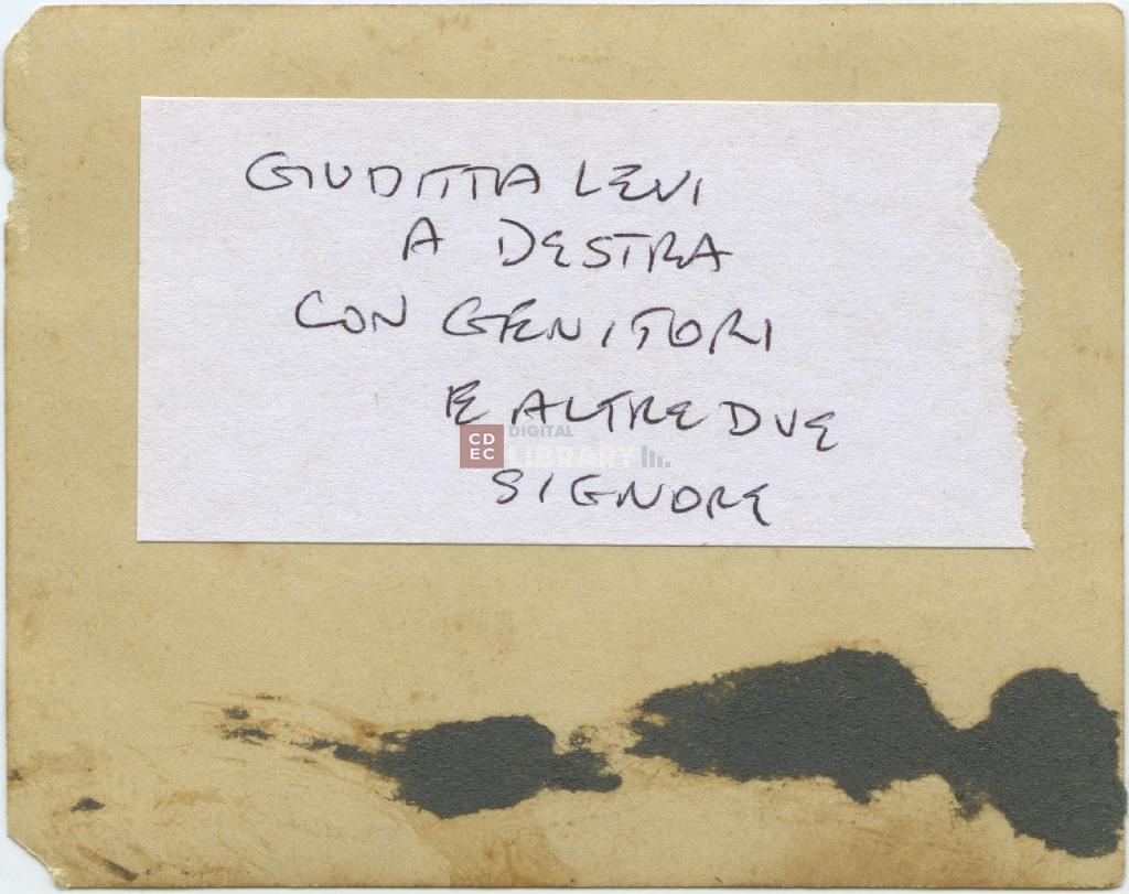 iscrizioni | sul verso del supporto un'etichetta con l'indicazione "Giuditta Levi a destra con genitori e altre due signore" |
