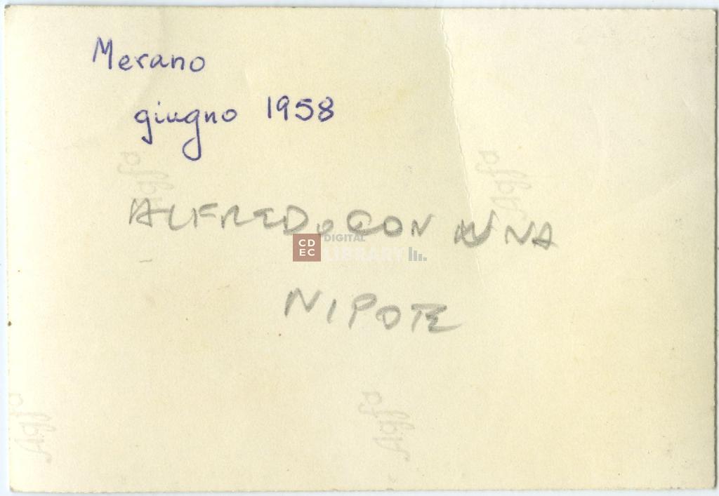 iscrizioni | sul verso del supporto l'indicazione manoscritta a penna "Merano giugno 1958" e a mano "Alfredo con una nipote" |