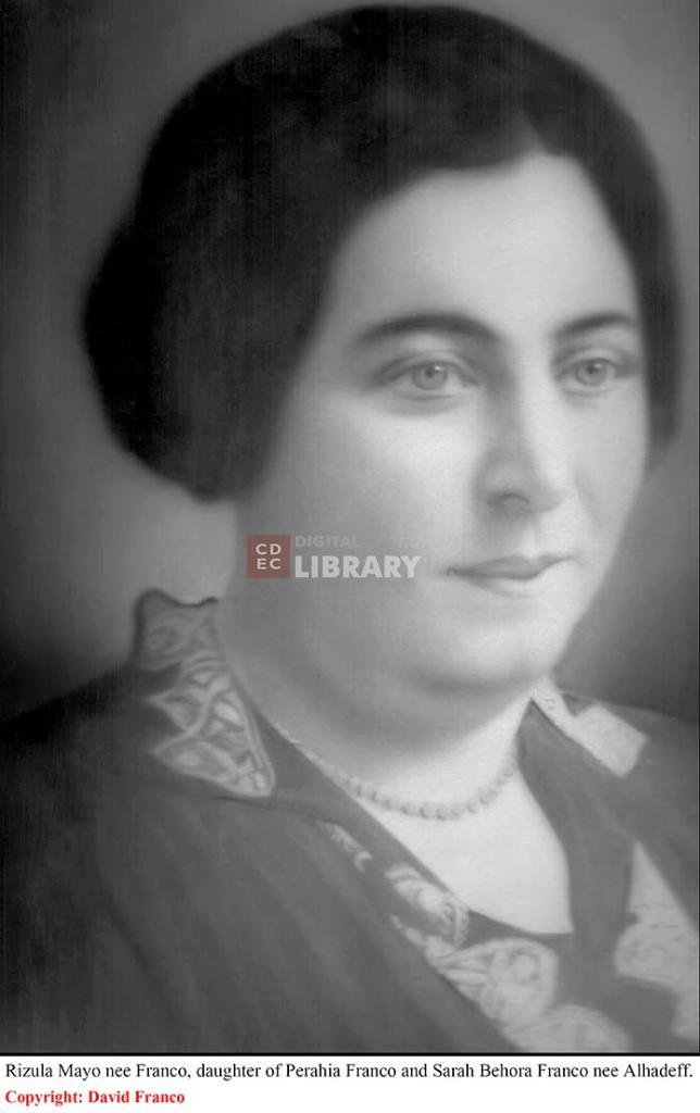 iscrizioni | sul recto del supporto in basso la didascalia tipografica "Rizula Mayo nee Franco, daughter of Perahia Franco and Sarah Behora Franco nee Alhadeff. Copyright: David Franco" |