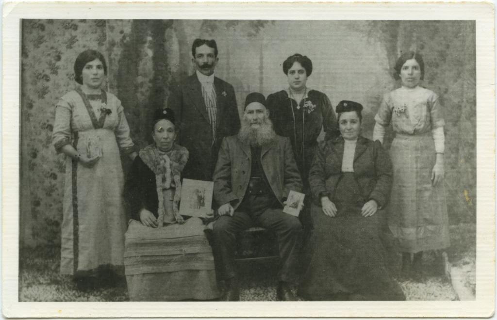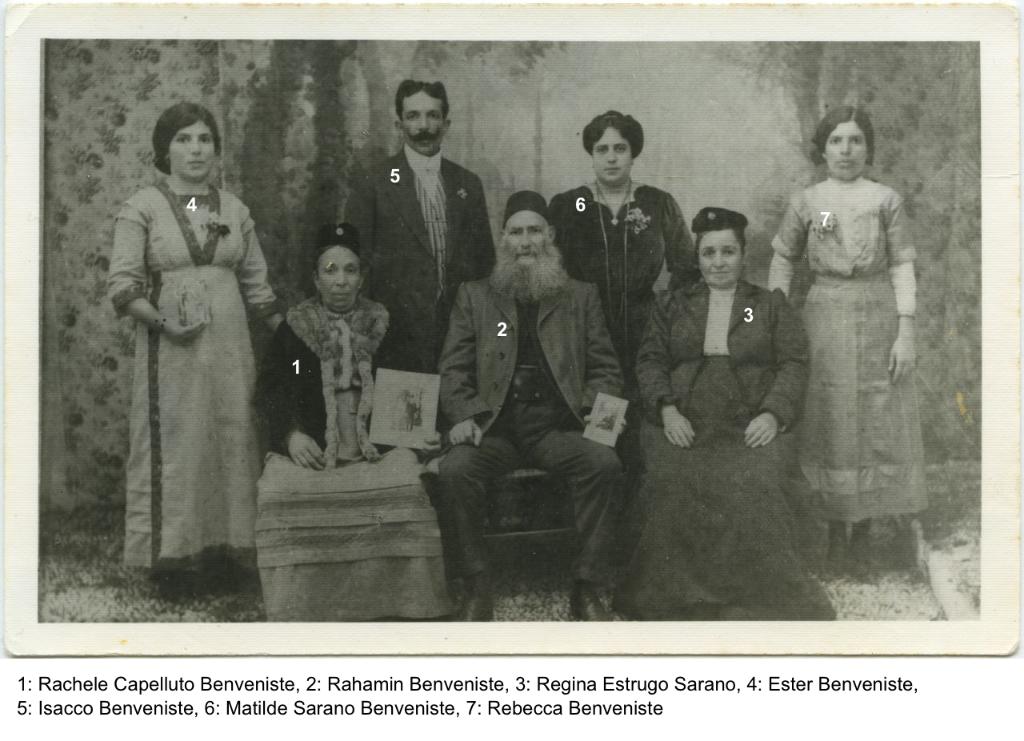 | osservazioni | Nella fotografia si riconoscono 1: Rachele Capelluto in Benveniste, 2: Rahamin Benveniste, 3: Reina Estrugo in Sarano, 4: Ester Benveniste, 5: Isacco Benveniste, 6: Matilde Sarano in Benveniste, 7: Rebecca Benveniste |