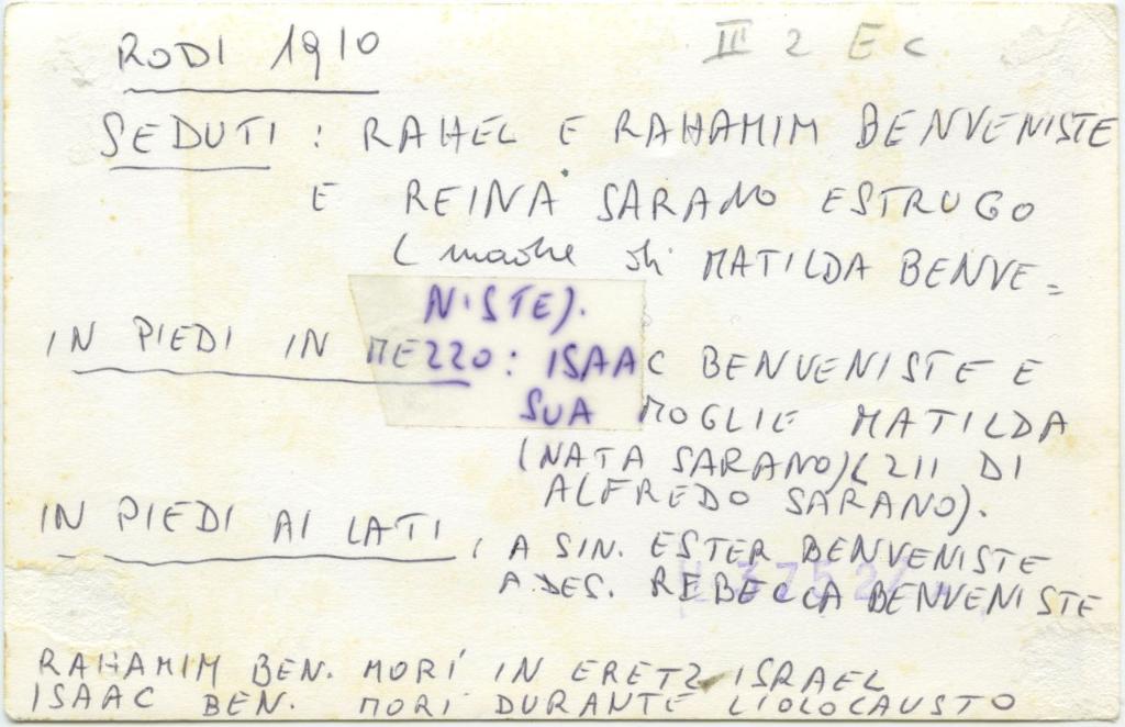 | notizie storico-critiche | Isacco Benveniste, vedovo di Matilda Sarano, fu arrestato e deportato da Rodi nel luglio 1944 ad Auschwitz, dove fu ucciso; il padre Rahamin morì invece in Israele La copia della fotografia fu fornita a Ester Menascé da Matilda Koen Sarano, per essere pubblicata nel suo volume "Gli ebrei a Rodi. Storia di un'antica comunità annientata dai nazisti" (1996) |