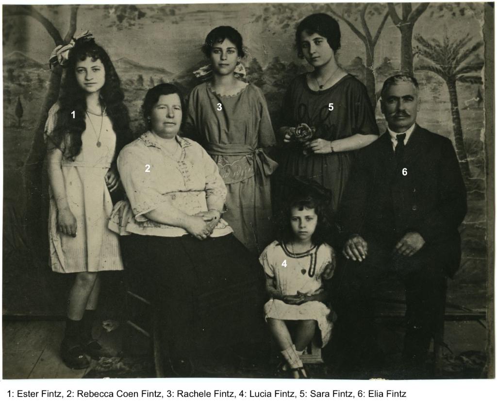 | osservazioni | Nella fotografia si riconoscono 1: Esther Fintz (poi coniugata Franco), 2: la madre Rebecca Coen in Fintz, 3: Rachel Fintz (poi coniugata Neppi Modona), 4: Lucia Fintz bambina, 5: Sara Fintz (poi coniugata Menascé), 6: il padre Elia Fintz |
