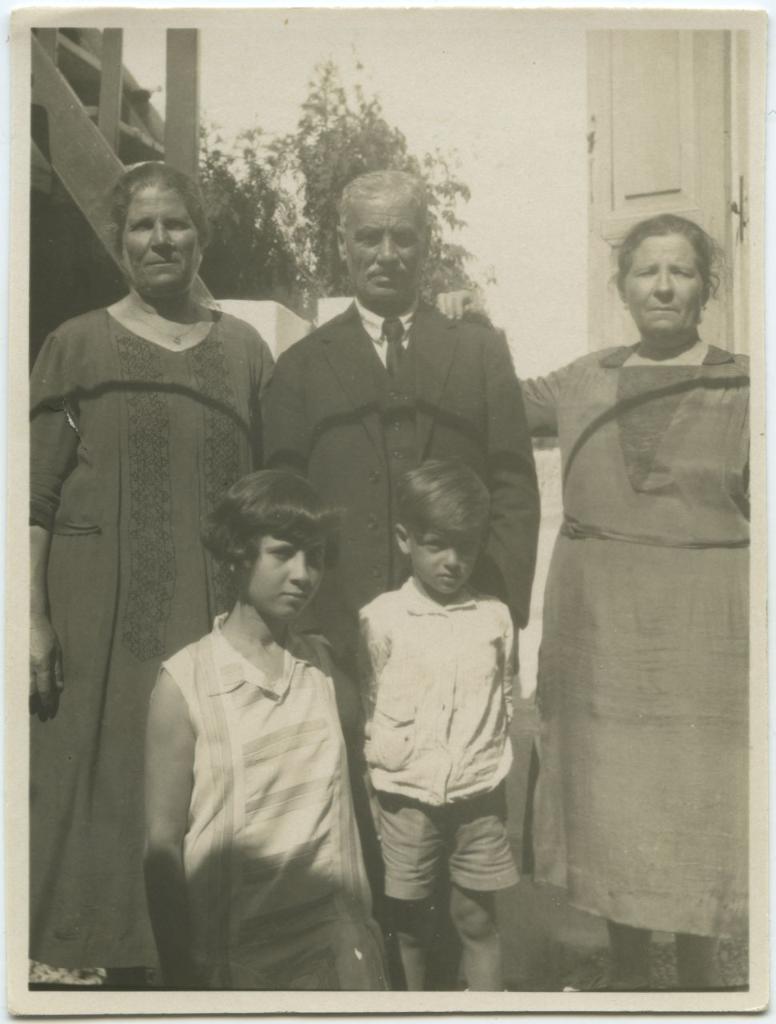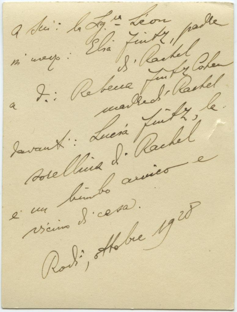 | iscrizioni | sul verso del supporto l'indicazione manoscritta "A sin: la Sig.ra Leon/ in mezzo: Elia Fintz, padre di Rachel/ a d. Rebecca Fintz Cohen madre di Rachel/ davanti: Lucia Fintz, la sorellina di Rachel e un bimbo amico e vicino di casa./ Rodi, ottobre 1928" |