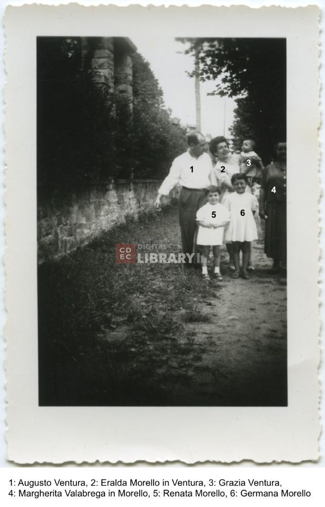 | osservazioni | Nella fotografia si riconoscono 1: Augusto Ventura, 2: Eralda Morello in Ventura, 3: Grazia Ventura neonata, 4: Margherita Valabrega in Morello, 5: Renata Morello, 6: Germana Morello (poi coniugata Rubatto) |