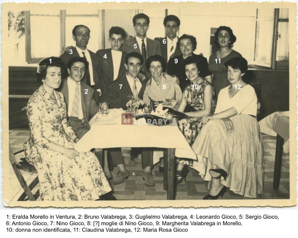 | osservazioni | Nella fotografia si riconoscono 1: Eralda Morello in Ventura, 2: Bruno Valabrega, 3: Guglielmo Valabrega, 4: Leonardo Gioco, 5: Sergio Gioco, 6: Antonio Gioco, 7: Nino Gioco, 8: [?] moglie di Nino Gioco, 9: Margherita Valabrega in Morello, 10: donna non identificata, 11: Claudina Valabrega, 12: Maria Rosa Gioco |