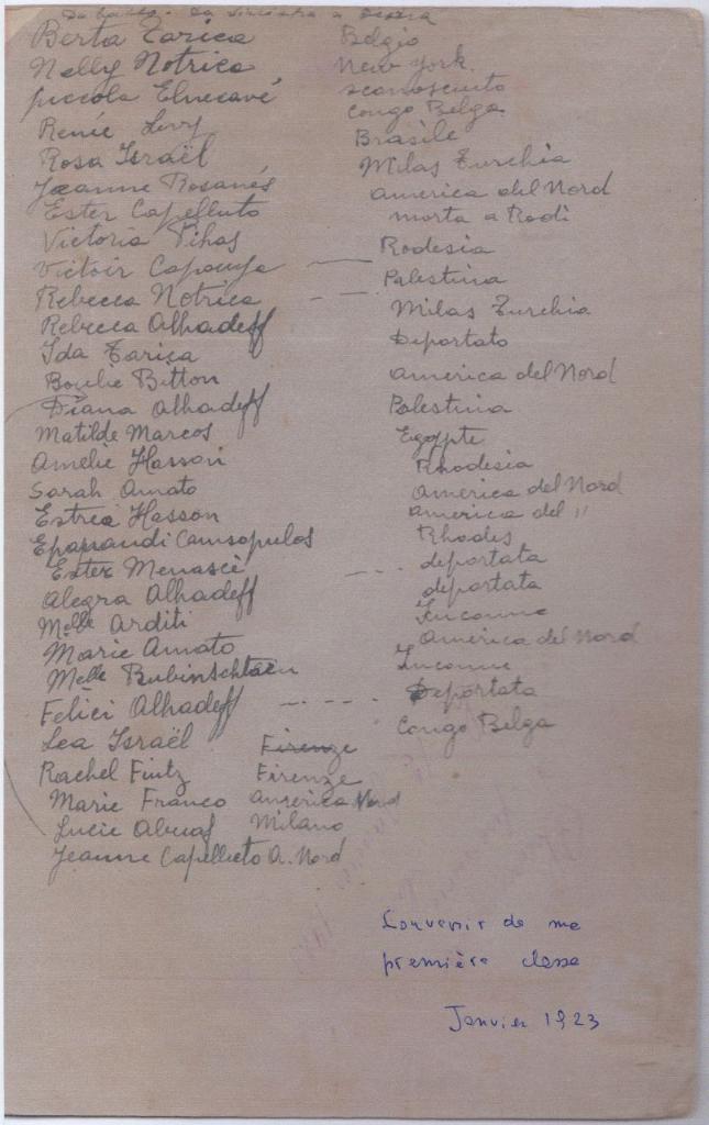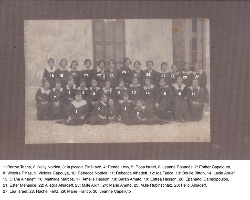 | osservazioni | Nella fotografia si riconoscono: 1: Berthe Tarica, 2: Nelly Notrica, 3: la piccola Elnékavé, 4: Renée Levy, 5: Rosa Israel, 6: Jeanne Rosanés, 7: Esther Capelouto, 8: Victoire Pihas, 9: Victoire Capouya, 10: Rebecca Notrica, 11: Rebecca Alhadeff, 12: Ida Tarica, 13: Boulie Bitton, 14: Lucie Abuaf, 15: Diana Alhadeff, 16: Mathilde Marcos, 17: Amélie Hasson, 18: Sarah Amato, 19: Estrea Hasson, 20: Epanandi Camsopoulos, 21: Ester Menascè, 22: Allegra Alhadeff, 23: M.lle Arditi, 24: Marie Amato, 25: M.lle Rubinschtaz, 26: Felici (Allegra) Alhadeff, 27: Lea Israel, 28: Rachel Fintz, 29: Marie Franco, 30: Jeanne Capelluto |