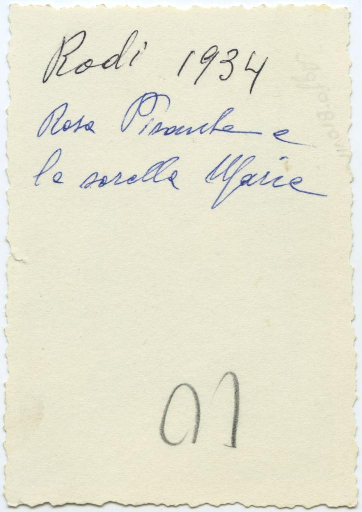 | iscrizioni | sul verso del supporto l'indicazione manoscritta "Rodi 1934/ Rosa Pisante e la sorella Maria" |