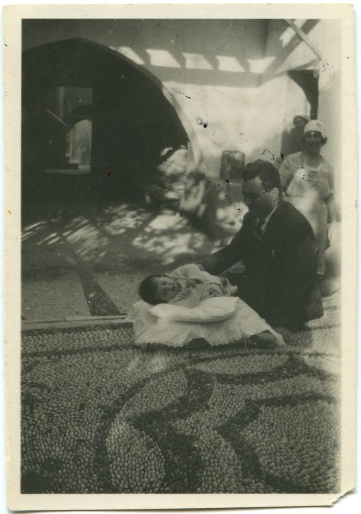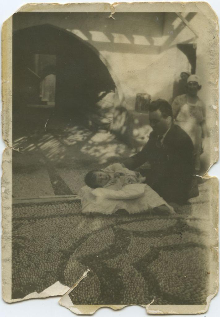 | notizie storico-critiche | La fotografia fu eseguita nel cortile interno (oggi scomparso) del piano terra della casa di Michele Menascé, caratterizzato da una pavimentazione acciottolata, con sassi bianchi e neri disposti artisticamente. Venne inviata a Rachele Fintz in Neppi Modona, zia materna di Ester Menascé. Si noti, in secondo piano sulla destra, la giovane donna greca incaricata della cura di Ester Menascé nei primi anni di vita a Rodi. |