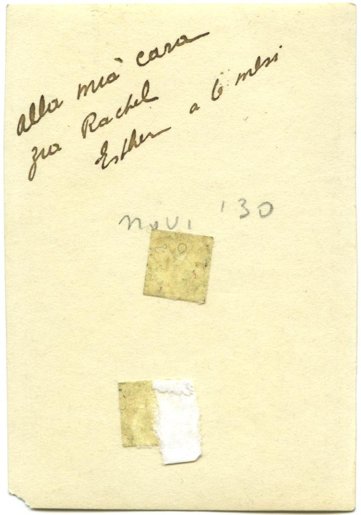 | iscrizioni | sul verso del secondo supporto la dedica manoscritta "alla mia cara zia Rachel/ Esther a 6 mesi" |
