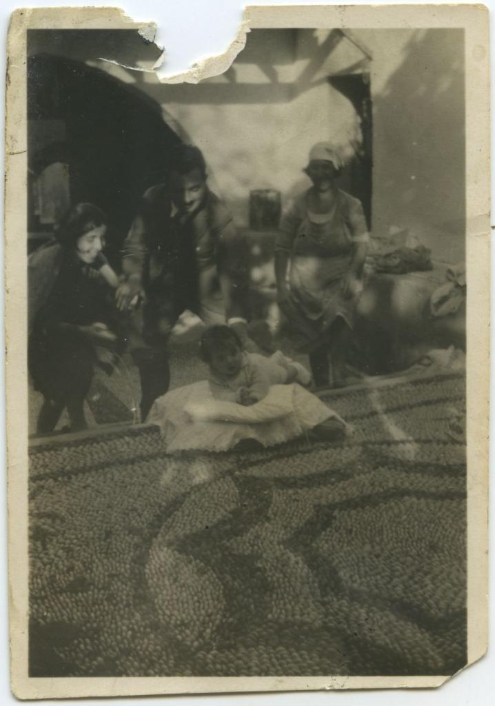 | notizie storico-critiche | La fotografia fu eseguita nel cortile interno (oggi scomparso) del piano terra della casa di Michele Menascé, caratterizzato da una pavimentazione acciottolata, con sassi bianchi e neri disposti artisticamente. Insieme alla famiglia Menascé, è ritratta la giovane donna greca incaricata della cura di Ester Menascé nei suoi primi anni di vita a Rodi. |