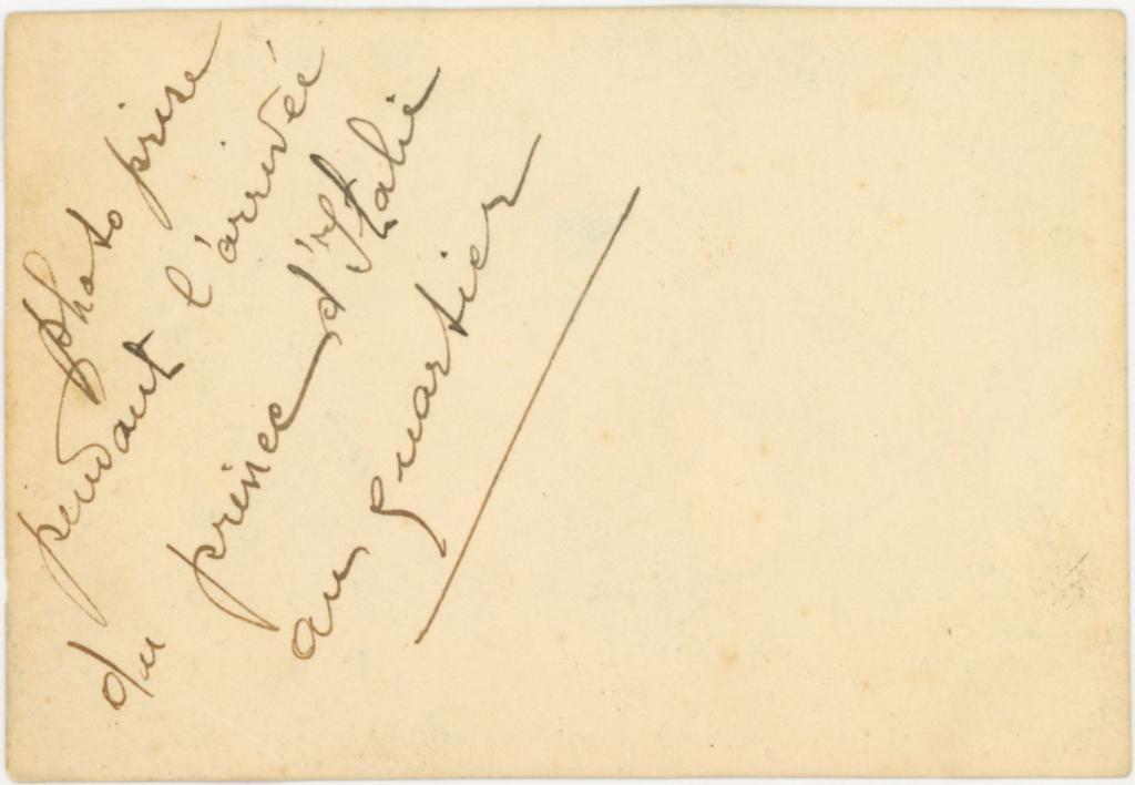 | iscrizioni | sul verso del supporto l'indicazione manoscritta in lingua francese "photo prise pendant l'arrivée du Prince d'Italie au quartier" [trad. foto scattata durante l'arrivo del Principe d'Italia al quartiere] |