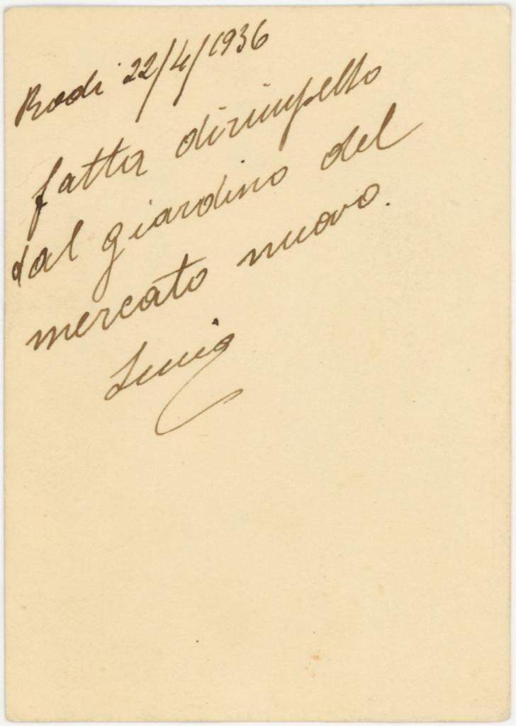| iscrizioni | sul verso del supporto l'indicazione manoscritta "Rodi 22/4/1936 fatta dirimpetto dal giardino del mercato nuovo. Lucia" |