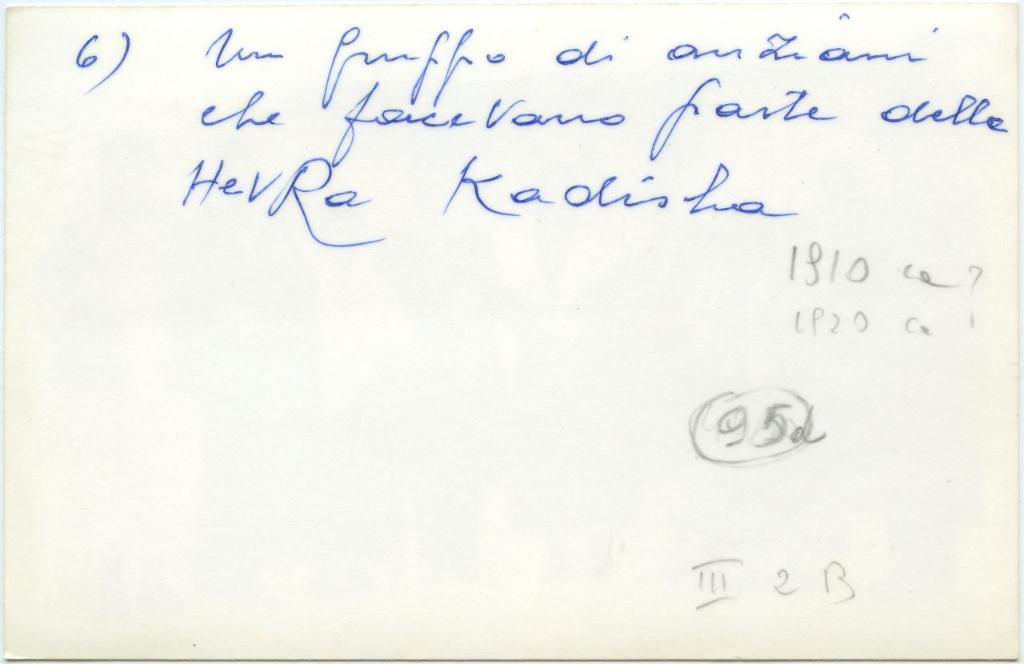 | iscrizioni | sul verso del supporto l'indicazione manoscritta "6) Un gruppo di anziani che facevano parte della Hevra Kadisha" |