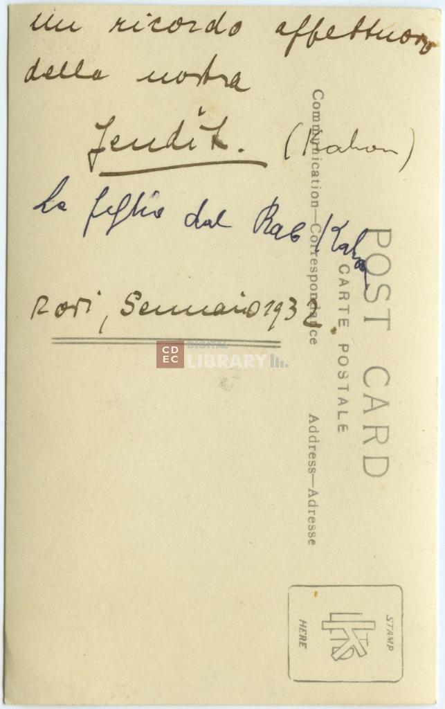 | iscrizioni | sul verso del supporto la dedica "Un ricordo affettuoso dalla nostra Jeudith (Kahan)/ la figlia del Rab Kahan/ Rodi, Gennaio 1932" |