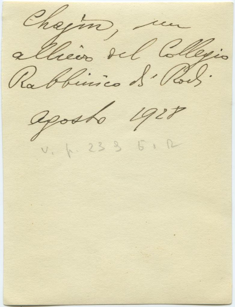 | iscrizioni | sul verso del supporto l'indicazione manoscritta "Chajm, un allievo del Collegio Rabbinico di Rodi agosto 1928" |