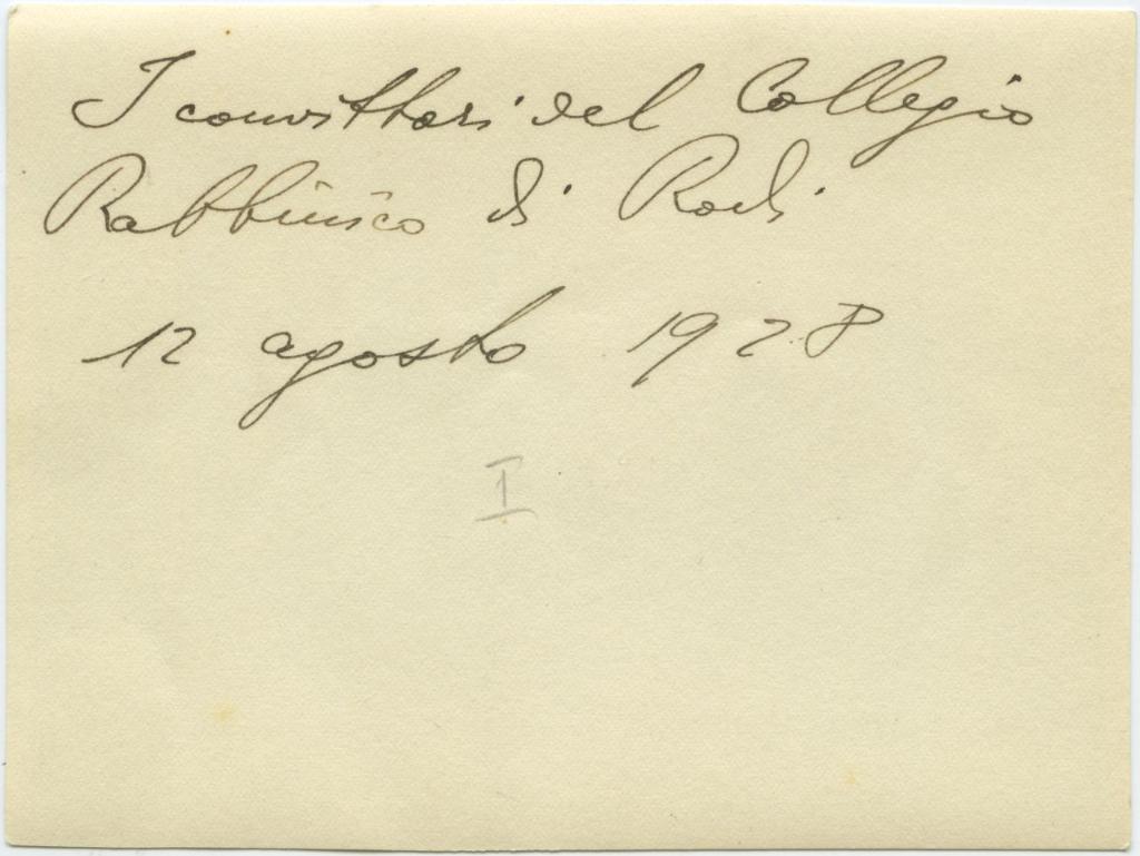 | iscrizioni | sul verso del supporto l'indicazione manoscritta "I convittori del Collegio Rabbinico di Rodi/ 12 agosto 1928" |