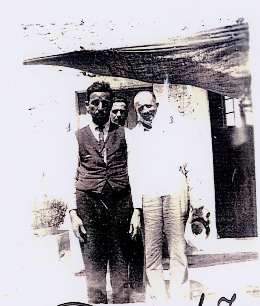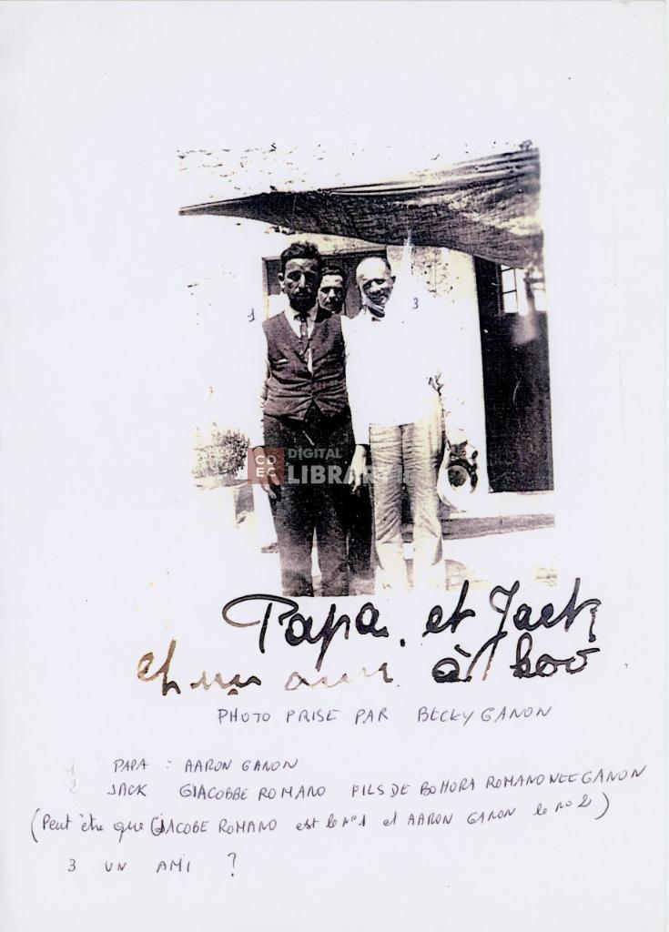 | iscrizioni | sul recto del supporto primario l'indicazione manoscritta "Papa et Jack et un ami è Coo" e su quello secondario "Photo prise par Becky Ganon/ Papa: Aaron Ganon/ Jack: Giacobbe Romano fils de Bohora Romano nee Ganon (Peut etre que Giacobe [sic] Romano est le n° 1 et Aaron Ganon le n° 2)/ 3 un ami?" |