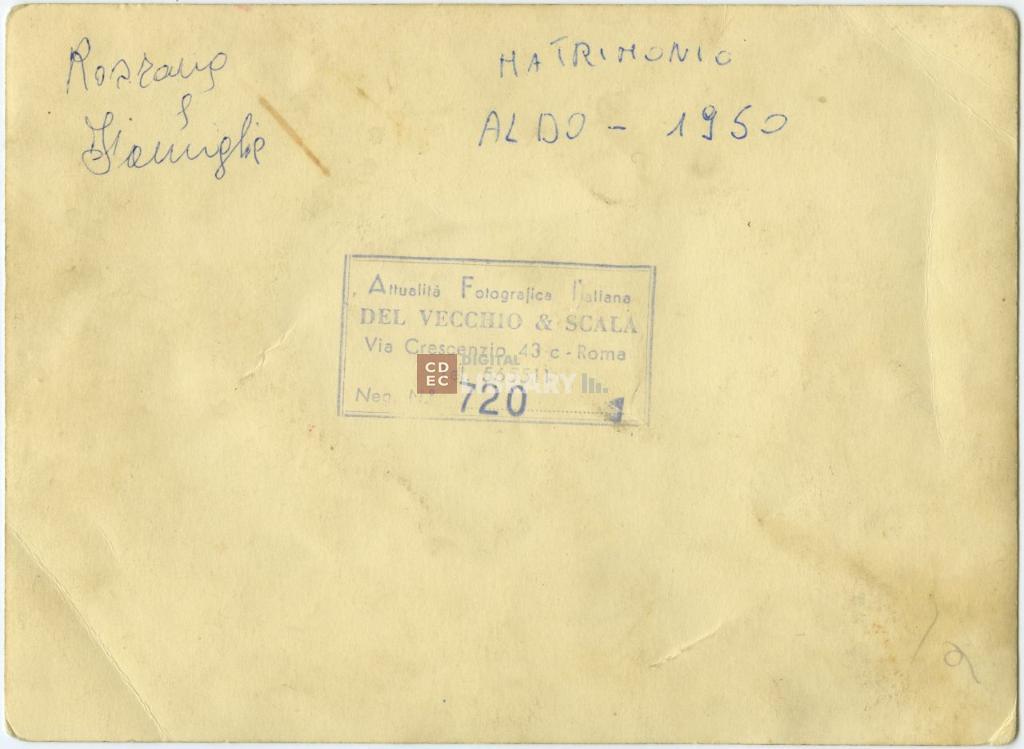 | iscrizioni | sul verso del supporto l'indicazione manoscritta "Rossana e Famiglia/ Matrimonio Aldo - 1950" |