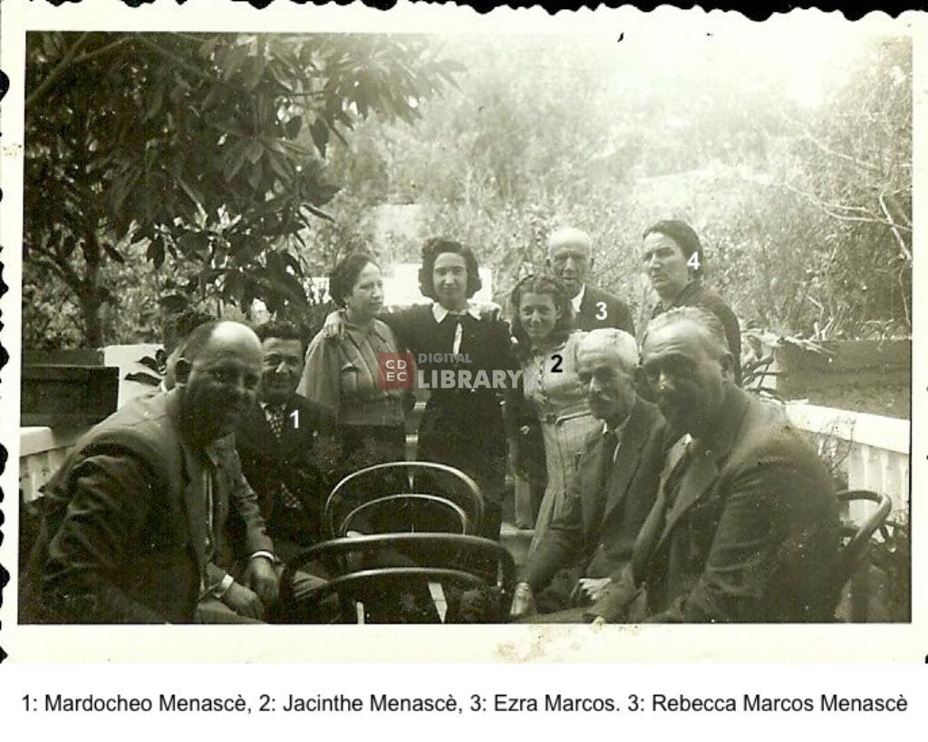 osservazioni | Nella fotografia sono ritratti in piedi da destra Rebecca Marcos in Menascé, Ezra Marcos e Jacinthe Menascé (poi coniugata Di Castro); seduto terzo da destra Mardocheo Menascé |