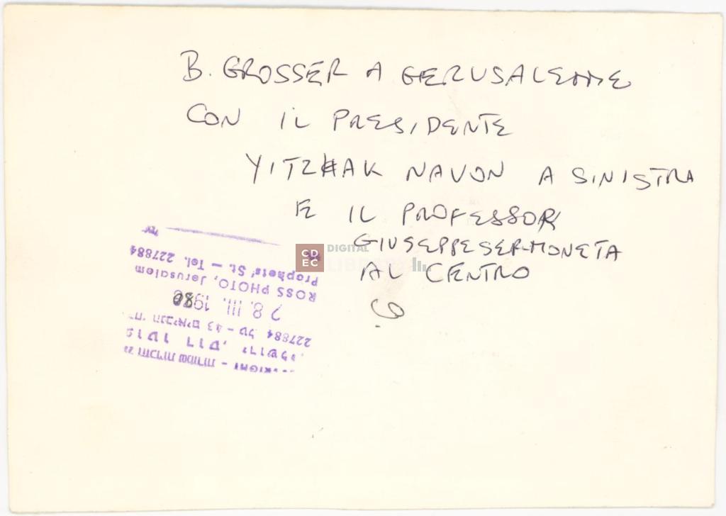 | iscrizioni | sul verso del supporto l'indicazione manoscritta da Donato Grosser "B. Grosser a Gerusalemme con il Presidente Yitzhak Navon a sinistra e il professor Giuseppe Sermoneta al centro" |