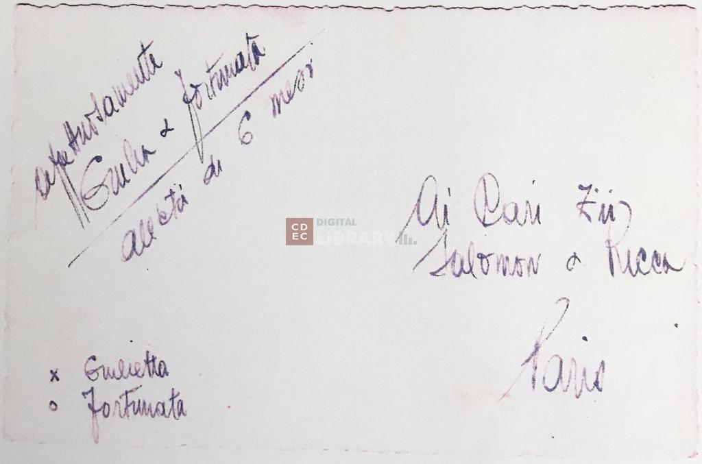 iscrizioni | sul verso del supporto la dedica manoscritta "affettuosamente Giulia e Fortunata all'età di 6 mesi/ x Giulietta o Fortunata" e l'intestazione "Ai Cari Zii Salomon e Ricca/ Paris" |