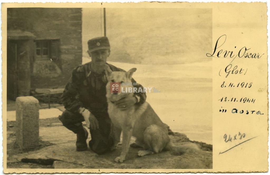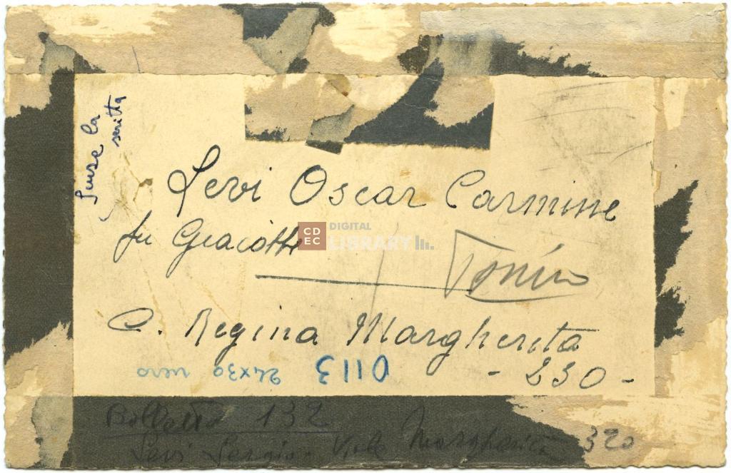iscrizioni | sul recto del supporto a destra l'iscrizione manoscritta "Levi Oscar (Glot) 8.4.1915 12.11.1944 in Aosta" - sul verso del supporto l'iscrizione manoscritta "Levi Oscar Carmine fu Giacobbe/ Torino C. Regina Margherita 230" e indicazioni tipografiche |