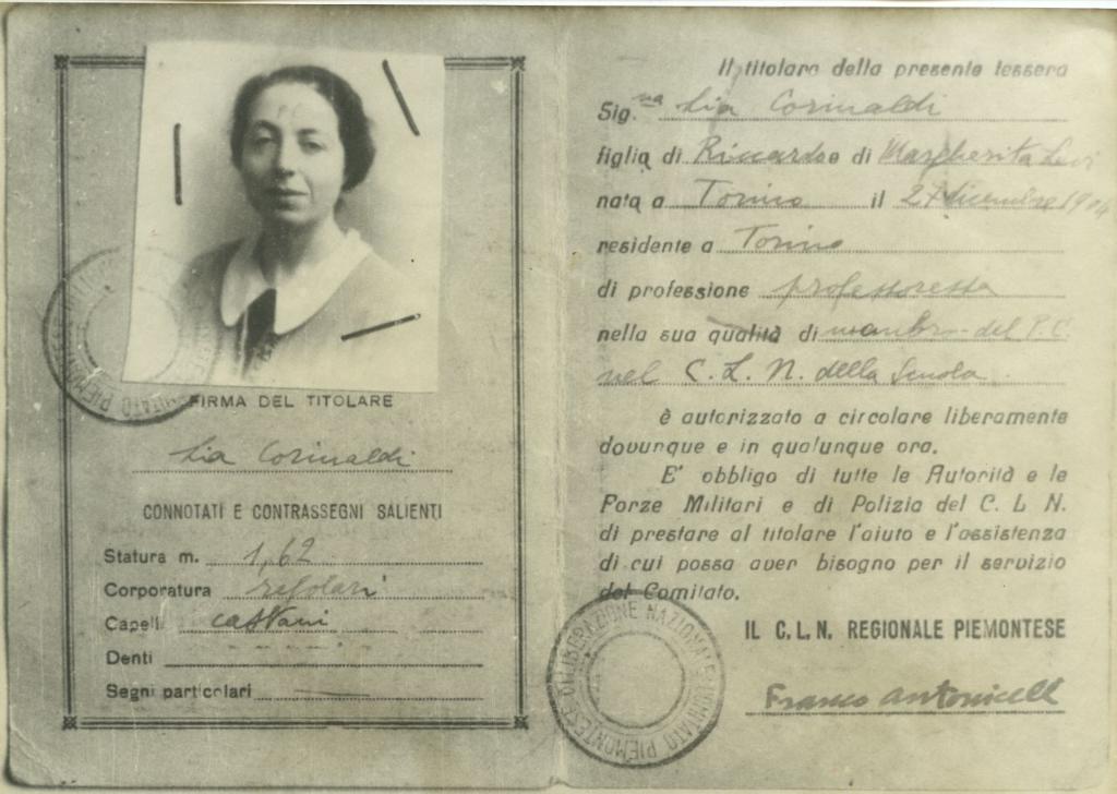 | notizie storico-critiche | La Tessera di riconoscimento fu rilasciata a Lia Corinaldi dal Comitato di Liberazione Nazionale in quanto "membro del P.C. nel C.L.N. della Scuola". Viene specificato che il titolare "è autorizzato a circolare liberamente dovunque e in qualunque ora. E' obbligo di tutte le Autorità e le Forze Militari e di Polizia del C.L.N. di prestare al titolare l'aiuto e l'assistenza di cui possa aver bisogno per il servizio del Comitato." |