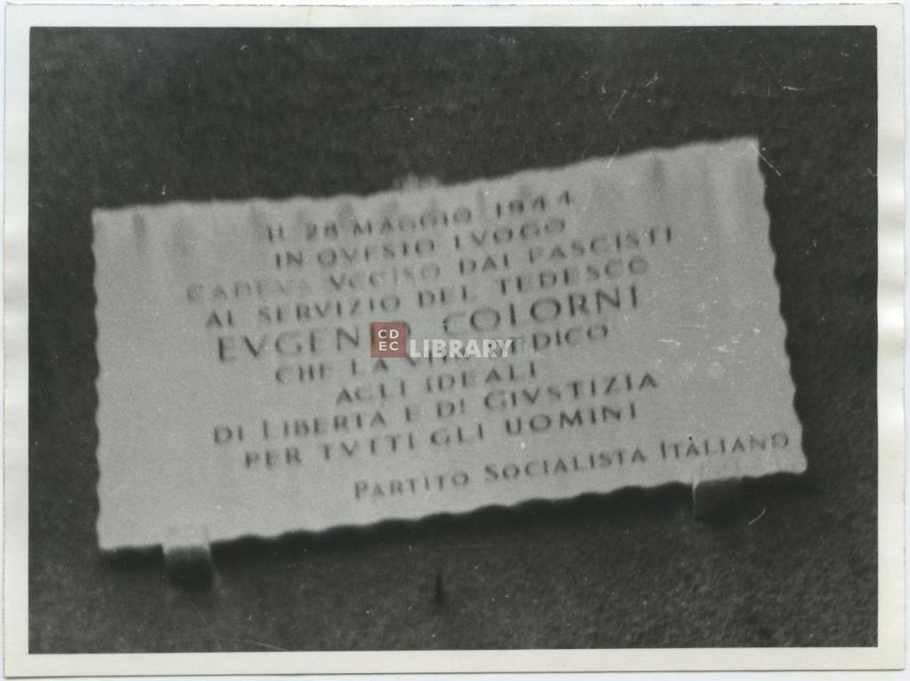 notizie storico-critiche | La targa (oggi non più esistente) fu posta dal Partito Socialista Italiano e collocata in via Livorno, nel luogo in cui fu gravemente ferito da una pattuglia di fascisti della banda Koch. La fotografia era in origine collocata in una busta di carta, insieme a un analogo scatto (inv. 141-s091-002), su era riportata la didascalia dattiloscritta "Eugenio Colorni/ Lapide posta in una via di Roma, presso Piazza Bologna" Si tratta forse di una delle lapidi distrutte da atti vandalici prima del 1982 |