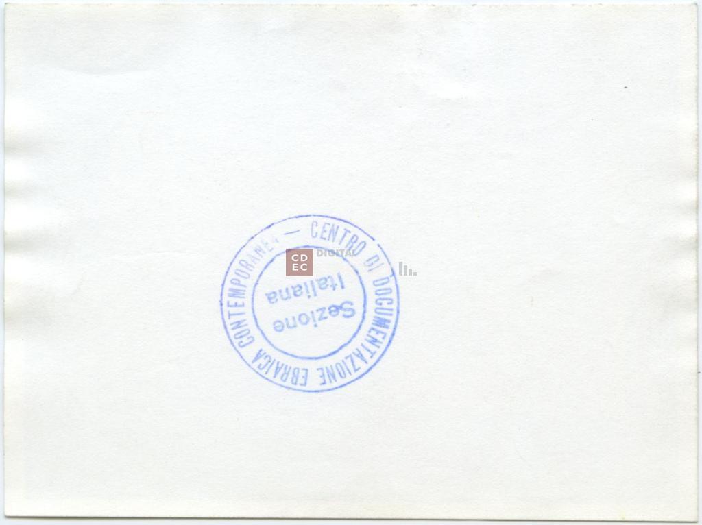 timbri, marchi | sul verso del supporto il timbro circolare con la scritta lungo il bordo "Centro di Documentazione Ebraica Contemporanea" e al centro "Sezione Italiana" |