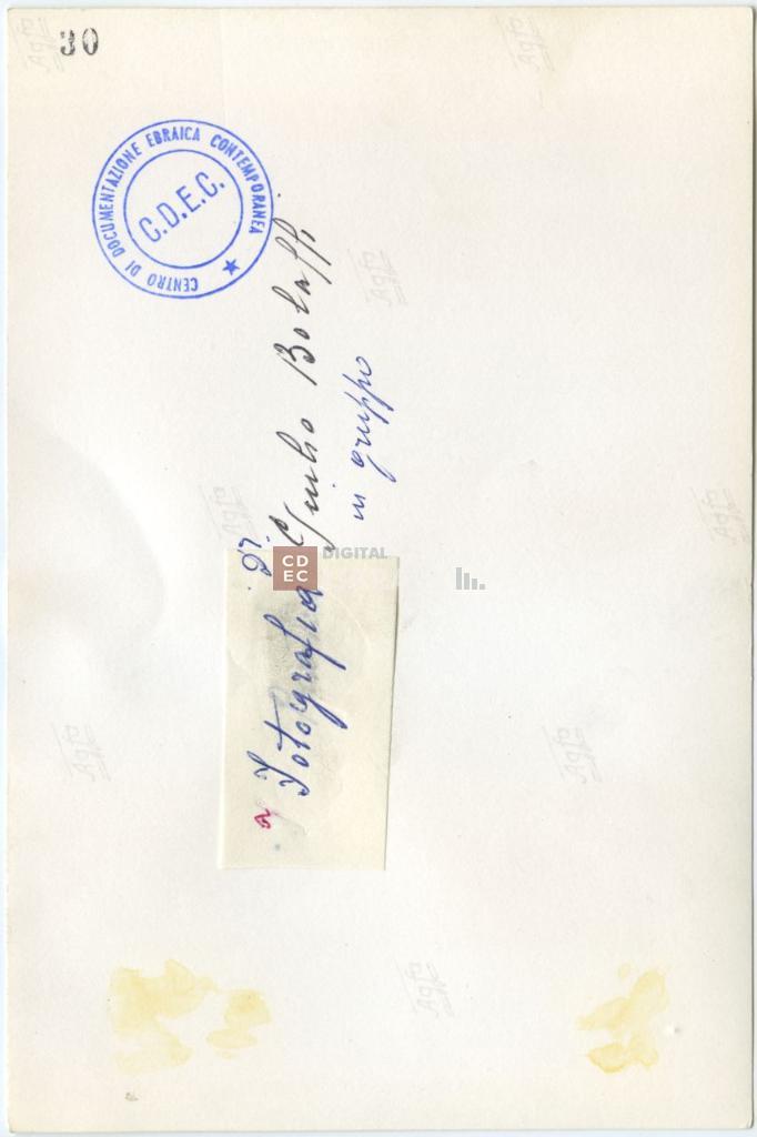 timbri, marchi | sul verso del supporto il timbro di collezione di forma circolare con la scritta lungo il bordo "Centro di Documentazione Ebraica Contemporanea" e al centro "Sezione Italiana" e il timbro di inventariazione dell'Ufficio Stralcio con il numero "30" |