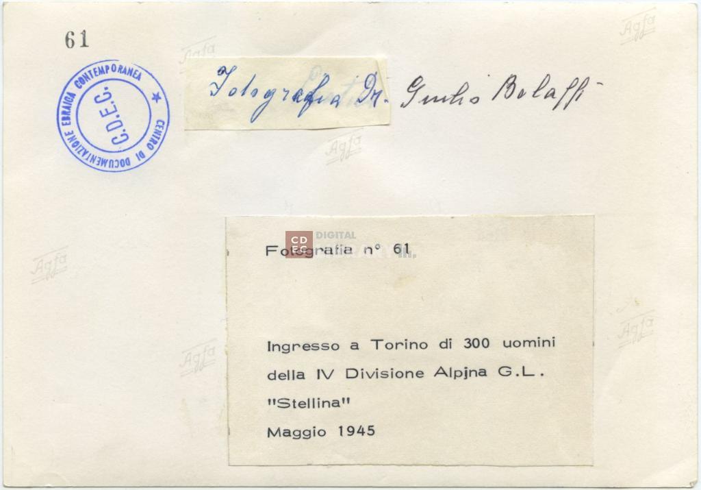 iscrizioni | sul verso del supporto l'indicazione manoscritta a penna "Fotografia Dr. Giulio Bolaffi" e un'etichetta con la didascalia dattiloscritta "Fotografia n. 61/ Ingresso a Torino di 300 uomini della IV Divisione Alpina G.L. "Stellina"/ Maggio 1945" |
