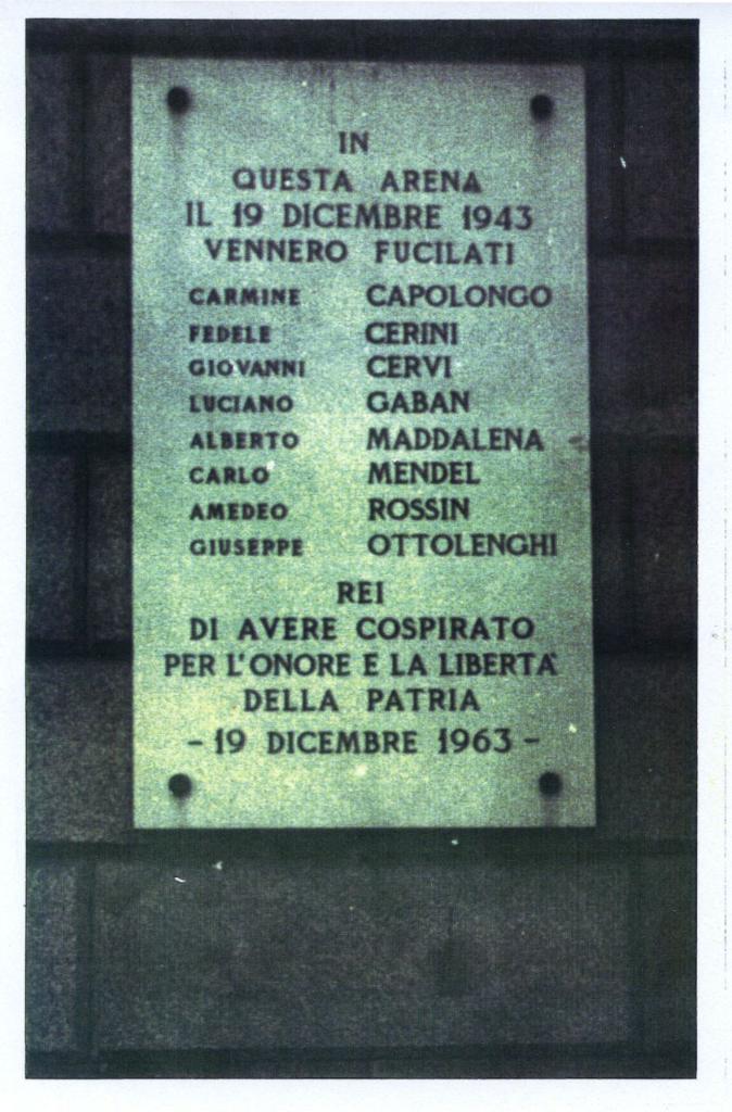 | iscrizioni | nell'immagine sulla lapide la scritta "In questa Arena il 19 dicembre 1943 vennero fucilati Carmine Capolongo/ Fedele Cerini/ Giovanni Cervi/ Luciano Gaban/ Alberto Maddalena/ Carlo Mendel/ Amedeo Rossin/ Giuseppe Ottolenghi rei di avere cospirato per l'onore e la libertà della Patria/ 19 dicembre 1963" - sul verso del supporto l'indicazione manoscritta in alto "lapide fuori arena Milano" |