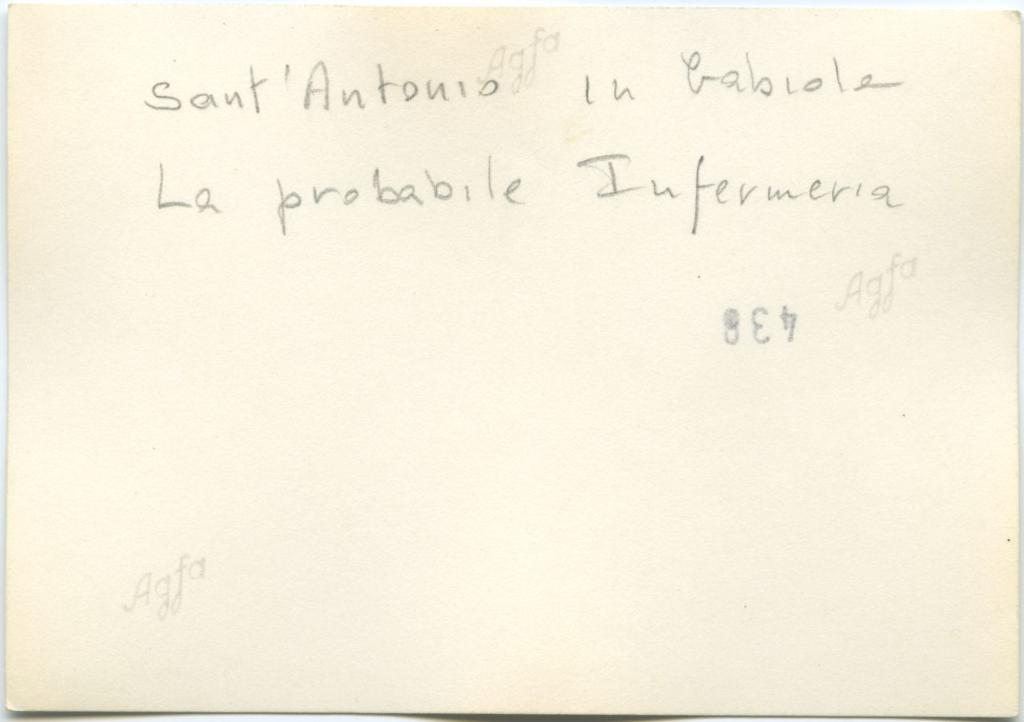 | iscrizioni | sul verso del supporto l'indicazione manoscritta "S. Antonio in Gabiola/ La probabile Infermeria" |