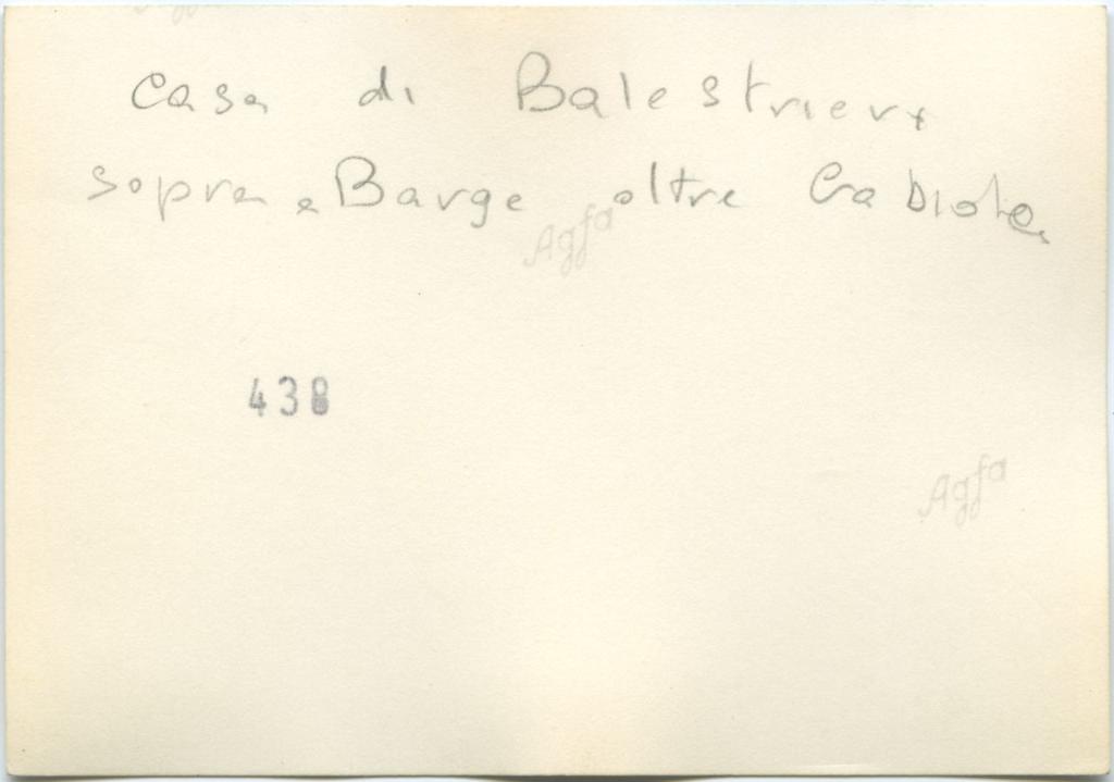 | notizie storico-critiche | Conservata in una busta di carta insieme ad altre 11 fotografie che mostrano "luoghi teatro di alcune battaglie partigiane". La casa, situata sopra Barge oltre la frazione Gabiola, durante la lotta di Resistenza fu utilizzata dal Comandante Balestrieri (nome di battaglia di Felice Burdino) come base operativa |