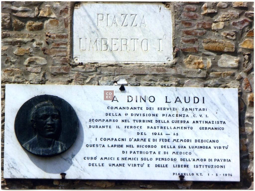 | notizie storico-critiche | Il 1° maggio 1976 venne collocata sul muro della Rocca municipale di Pianello Val Tidone (Piacenza) in Piazza Umberto i una lapide in memoria del dottor Rinaldo Laudi, nome di battaglia Dino. Su di essa è posto un ritratto in bronzo di Rinaldo Laudi e riportata la seguente dedica: "A Dino Laudi/ Comandante dei servizi sanitari della 1a Divisione Piacenza C.V.I. scomparso nel turbine della guerra antinazista durante il feroce rastrellamento germanico del 1944-45/ I compagni d'arme e di fede memori dedicano questa lapide nel ricordo della sua luminosa virtù di patriota e di medico/ curò amici e nemici solo pensoso dell'amor di patria delle umane virtù e delle libere istituzioni/ Pianello V.T. 1-5-1976" |
