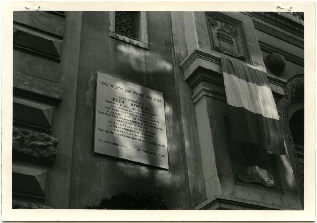 | notizie storico-critiche | La lapide commemorativa in ricordo di Rita Rosani fu posta sulla parte sinistra della facciata del Tempio israelitico di Verona. Sulla lapide fu apposta la seguente iscrizione: "Alla memoria di Rita Rosani/ medaglia d'oro della Resistenza/ che immolò la giovane vita/ per i più alti ideali dell'umanità/ e perché non si credessero/ inerti le vittime incontrastati gli oppressori/ gli ebrei d'Italia/ ad esaltarne il sacrificio/ a tramandare il ricordo/ questa lapide posero/ nel Decimo anniversario della Liberazione/ 30 ottobre 1955 14 Cheshvan 5716". Nel fascicolo è conservato un negativo su pellicola che riproduce la stampa fotografica |