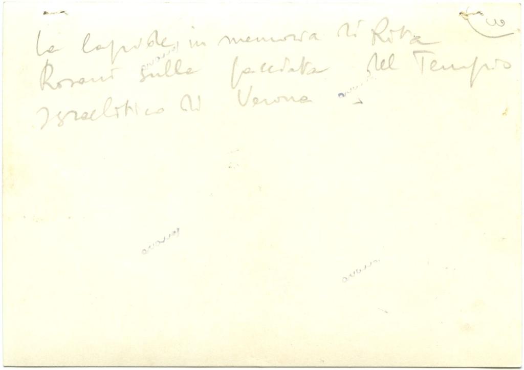 | iscrizioni | sul verso del supporto l'indicazione manoscritta "La lapide in memoria di Rita Rosani sulla facciata del Tempio Israelitico di Verona" |