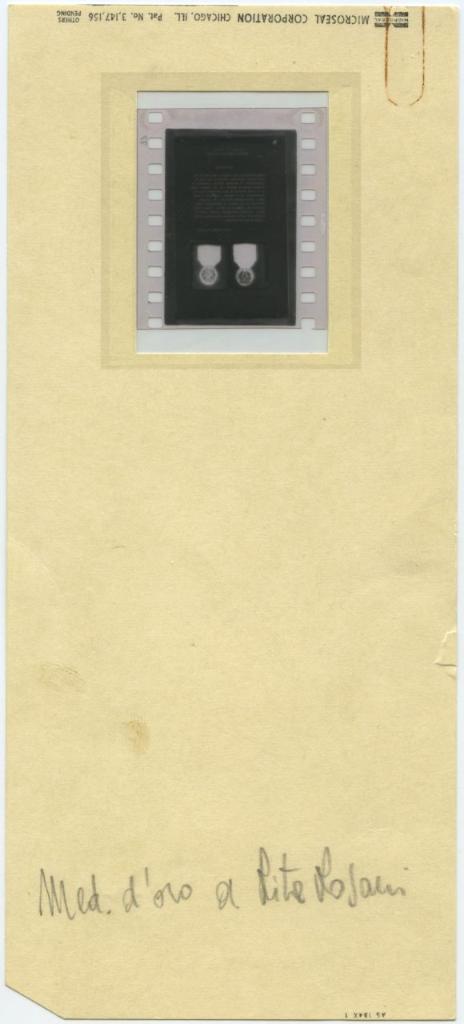 | notizie storico-critiche | nel fascicolo è conservato un fotogramma 35 mm che riproduce la stampa fotografica come si trovava inizialmente unita a un foglio dattiloscritto su cui è riportata la "Motivazione" del conferimento |