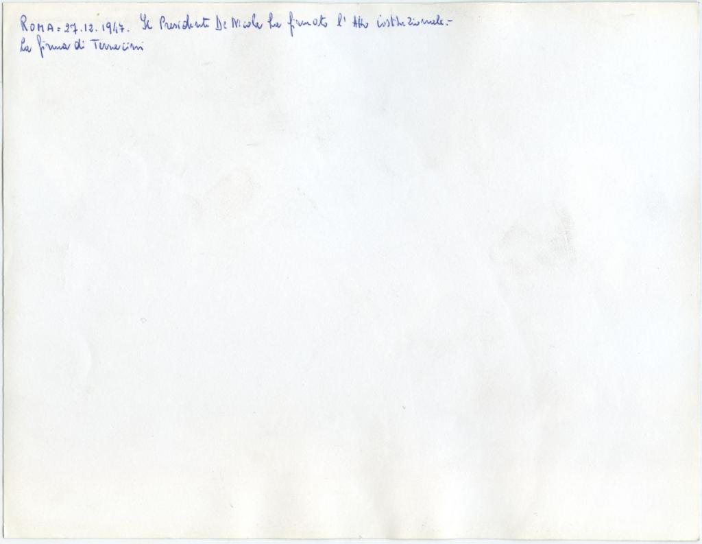 | iscrizioni | sul verso del supporto l'indicazione manoscritta "Roma - 27.12.1947. Il Presidente De Nicola ha firmato l'Atto Costituzionale. La firma di Terracini" |