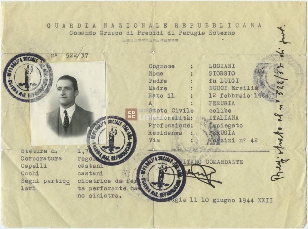 titolo attribuito | Documento del Comando Gruppo di presidi di Perugia Esterno della Guardia nazionale repubblicana di Giorgio Luciani (alias Lucio Servadio) |