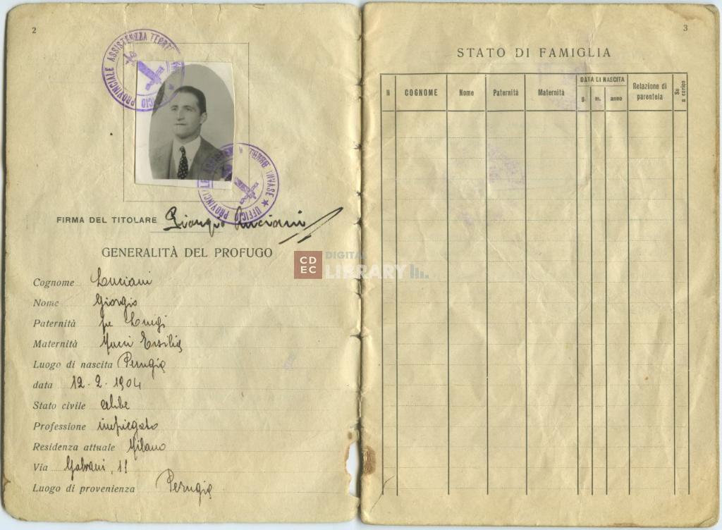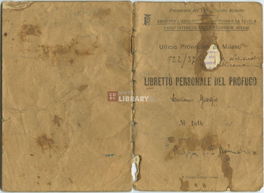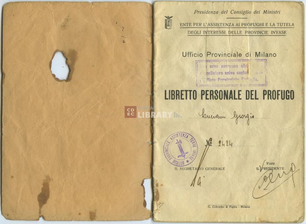 notizie storico-critiche | Il Libretto personale del profugo n. 2424 riporta le false generalità di Lucio Servadio, indicato come Giorgio Luciani figlio di Luigi ed Ersilia Nucci. Fu rilasciato dall'Ufficio Provinciale di Milano dell'Ente per l'Assistenza ai profughi e la tutela degli interessi delle province invase |