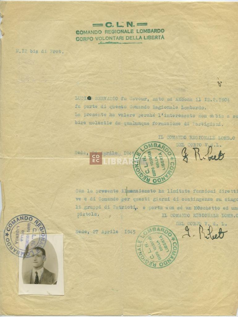 titolo attribuito | Dichiarazione di appartenenza al Comando Regionale Lombardo del Corpo Volontari della Libertà di Lucio Servadio |