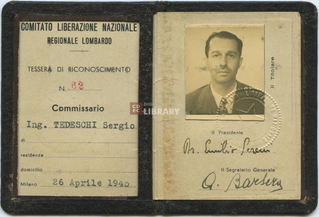 notizie storico-critiche | La tessera di riconoscimento n.62 fu rilasciata dal Comitato di Liberazione Nazionale Regionale Lombardo al Commissario Ing. Tedeschi Sergio a Milano il 26 aprile 1945 |