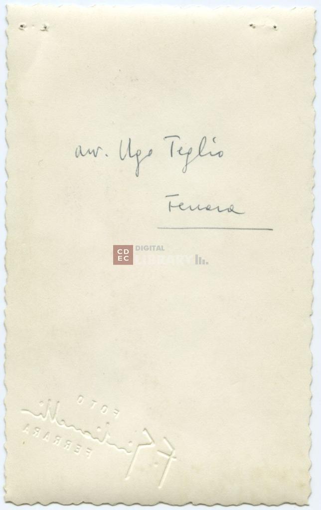 iscrizioni | sul verso del supporto l'indicazione manoscritta "avv. Ugo Teglio/ Ferrara" |