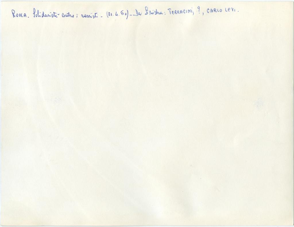 | iscrizioni | sul verso del supporto l'indicazione manoscritta "Roma - Solidarietà contro i razzisti (31.4.60). Da sinistra: Terracini, ?, Carlo Levi" |