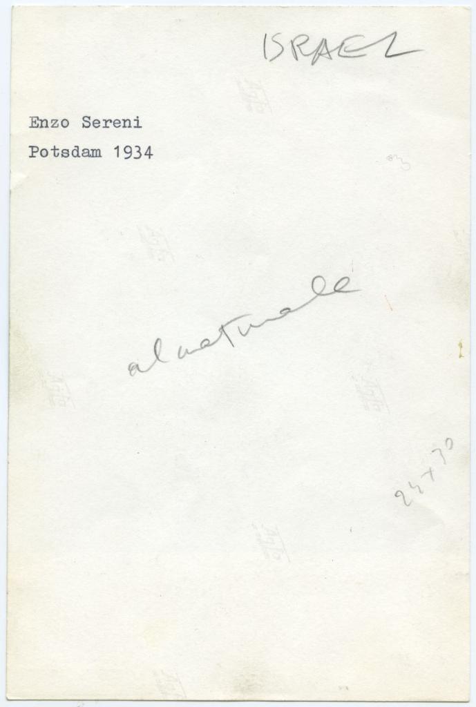 | iscrizioni | sul verso del supporto l'indicazione dattiloscritta "Enzo Sereni/ Potsdam 1934" e a mano "Israel/ al naturale" |
