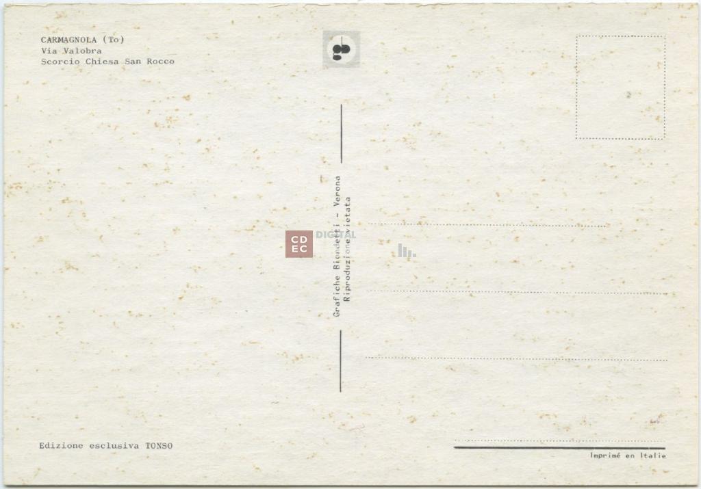 iscrizioni | sul verso del supporto le iscrizioni editoriali "Carmagnola (TO) Via Valobra Scorcio Chiesa San Rocco/ Edizione esclusiva Tonso/ Grafiche Biondetti - Verona Riproduzione vietata/ Imprimé en Italie" |