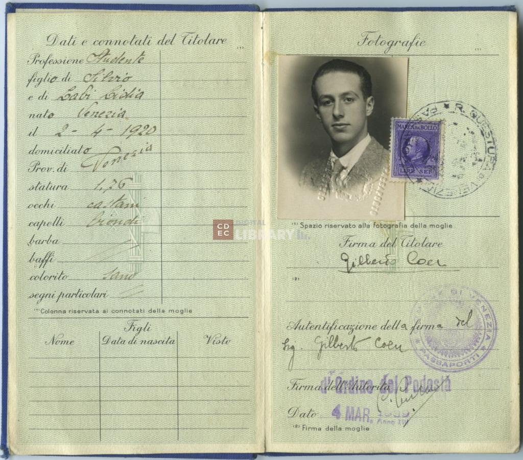 notizie storico-critiche | Passaporto per l'estero emesso dal Regno d'Italia e rilasciato dalla R. Questura di Venezia il 4 marzo 1939 per espatrio verso Svizzera e Inghilterra. Nel 1939 Gilberto Coen, a seguito dell'emanazione delle leggi razziste, emigra in Svizzera dove si iscrive all'Università di Losanna al ciclo di studi in Ingegneria chimica |