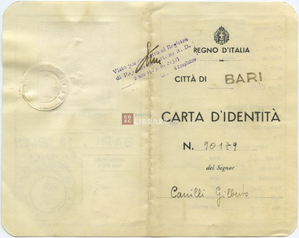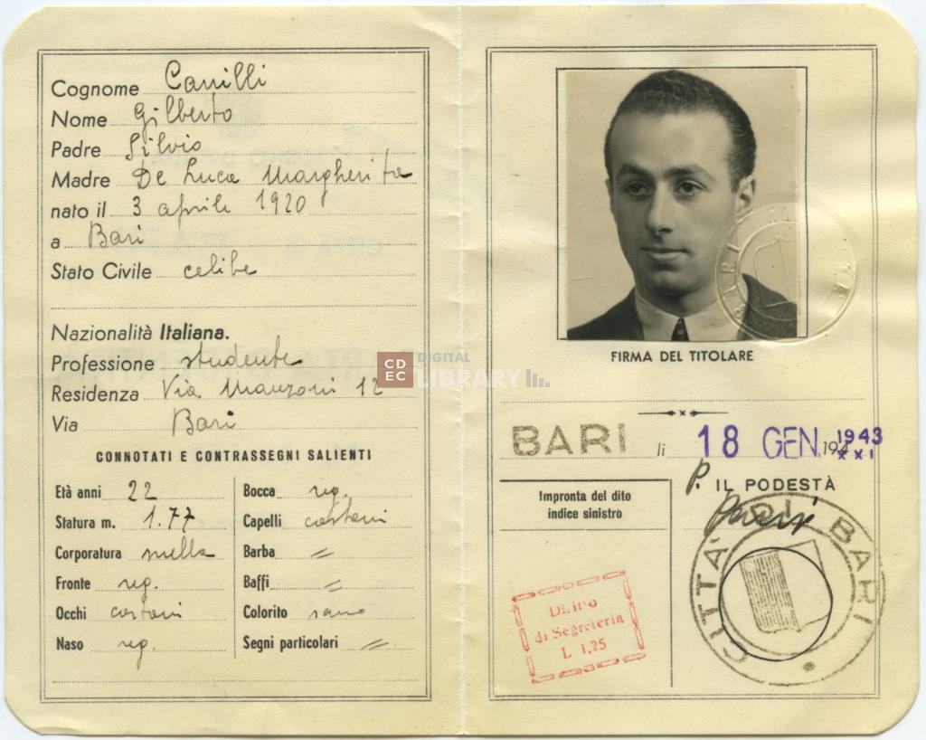 notizie storico-critiche | La falsa carta d'identità, intitolata a Gilberto Camilli di Silvio e Margherita De Luca, risulta emessa a Bari il 18 gennaio 1943 |